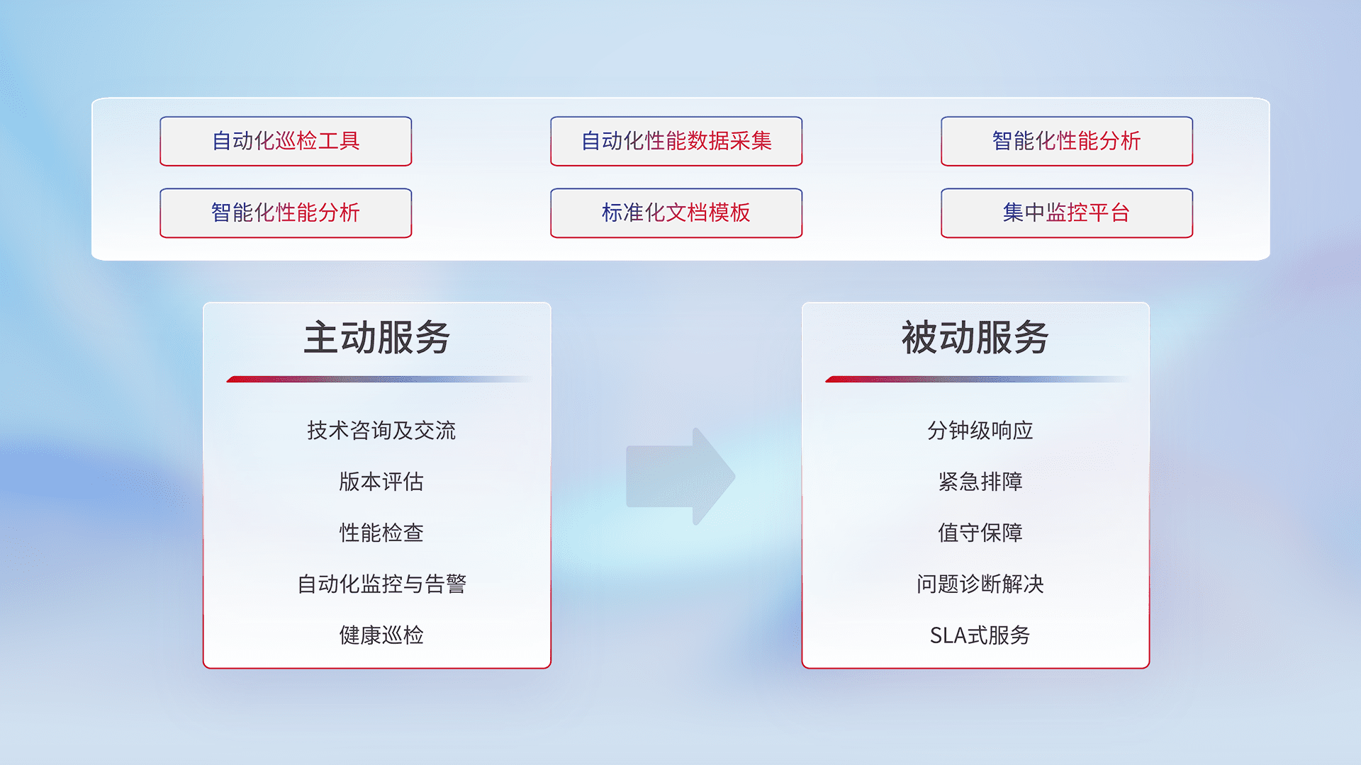 智能化工具和标准化文档,,,,保障服务质量,,提供主动服务(包含技术咨询、、、、版本评估、、、性能检查、、、、自动化监控与告警、、健康巡检)和被动服务包含(分钟级响应、、紧急排障、、值守保障、、、、问题诊断解决、、、SLA服务)。。。。